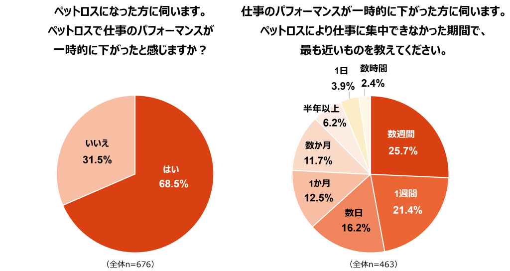 ペットロスにより仕事のパフォーマンスが一時的に下がったと感じる飼育者は68.5%で、約7割に影響が出ていることが分かりました。