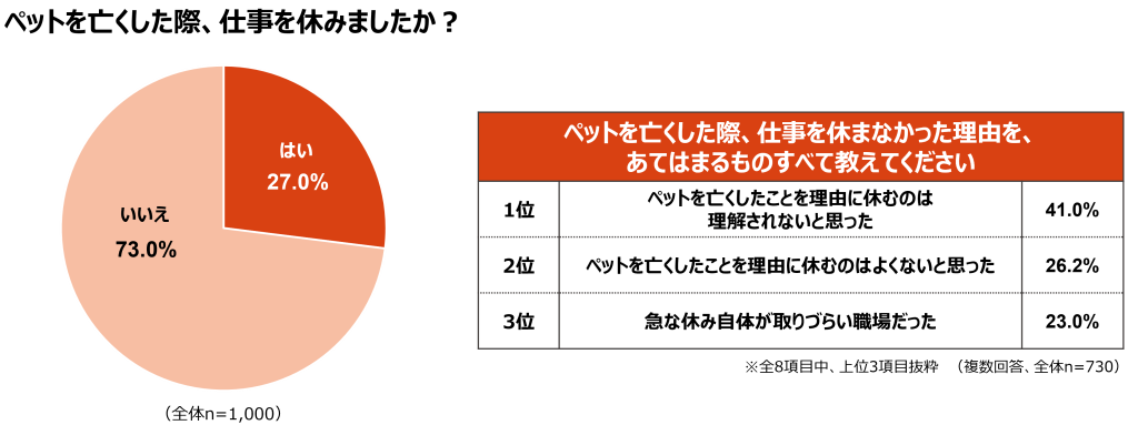 ペットを亡くした際、仕事を休んだかという問いには、73.0%が「いいえ」と回答しました。